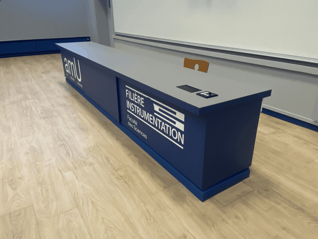 Le projet consiste en la personnalisation et la mise en conformité visuelle d’un bureau magistral (banque) situé dans un amphithéâtre de la Faculté des Sciences d’Aix-Marseille Université (AMU).