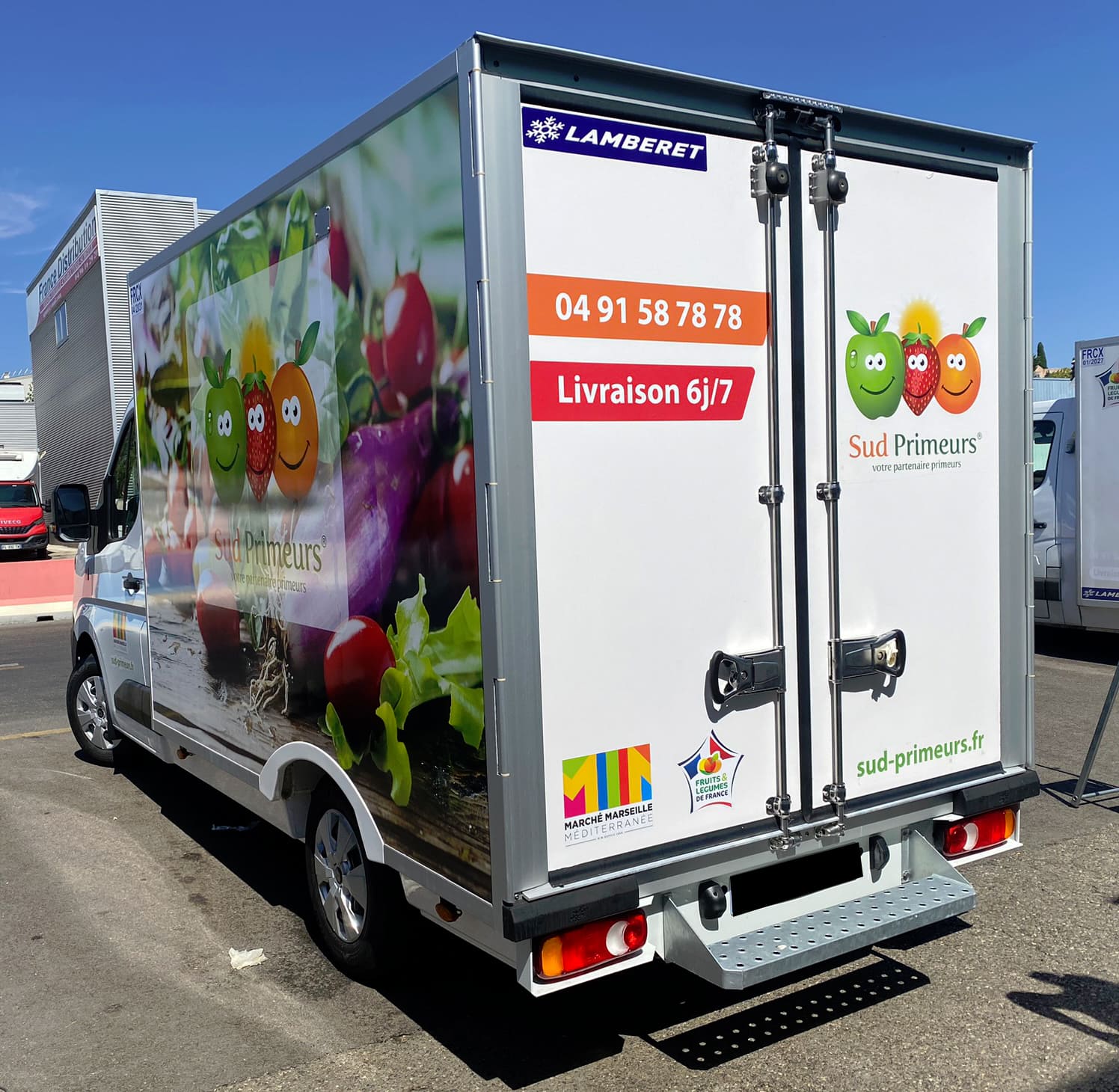 Le Client et l’Enjeu : Le client, Sud Primeurs, est une entreprise de distribution de fruits et légumes frais, utilisant une flotte de véhicules utilitaires frigorifiques pour ses livraisons. L’objectif était de transformer ces outils logistiques en de puissants supports de communication mobile.