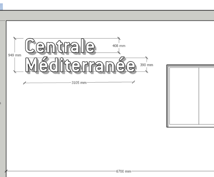 Contraintes : L’enseigne doit être installée sur une surface de 6,70 mètres de large avec une fenêtre sur le côté droit , à une hauteur importante nécessitant des moyens de levage, et doit résister aux conditions climatiques (vent, UV).