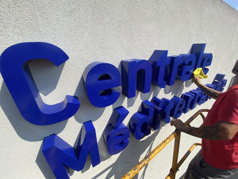 Impact visuel : Le relief des lettres crée des ombres portées naturelles qui renforcent le contraste et la lisibilité selon l’exposition au soleil.